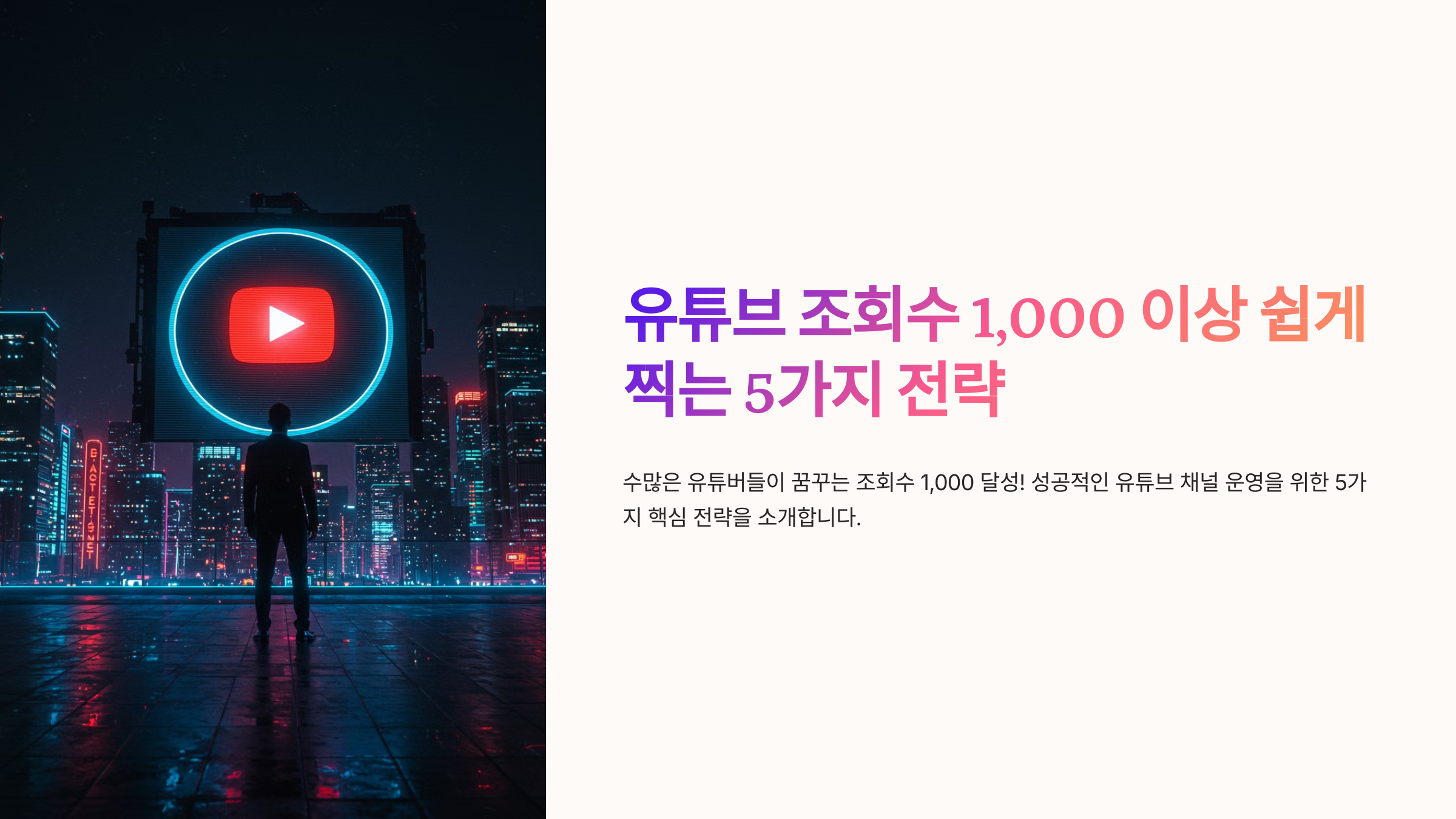 많은 사람들이 유튜브를 시작하지만, 유튜브 조회수 1,000을 넘기지 못하는 이유는 체계적인 전략 없이 영상을 업로드하기 때문이다. 유튜브 조회수 늘리기 위해서는 강력한 썸네일과 제목, 시청 유지율 관리, 키워드 최적화, 외부 트래픽 활용, 정기적 업로드가 필수다.