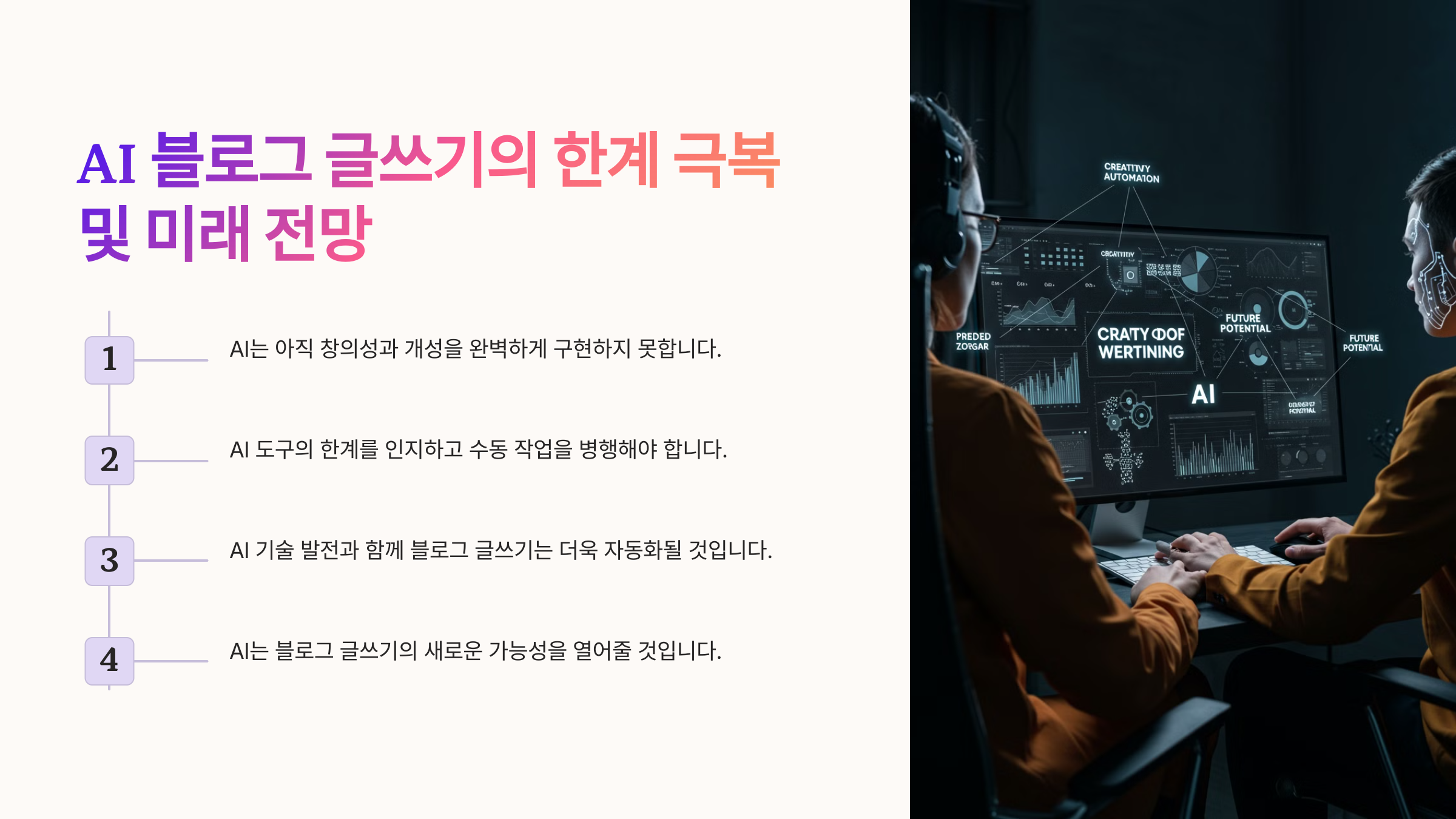 AI 글쓰기 도구는 강력하지만, 여전히 한계가 존재한다. 완전한 자동화보다는 AI를 보조 도구로 활용하여 콘텐츠 품질을 유지하는 것이 중요하다.