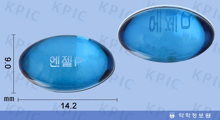 | 성상 | 무색 내지 연한 청색의 투명한 내용물이 든 청색의 투명한 타원형 연질 캡슐 |